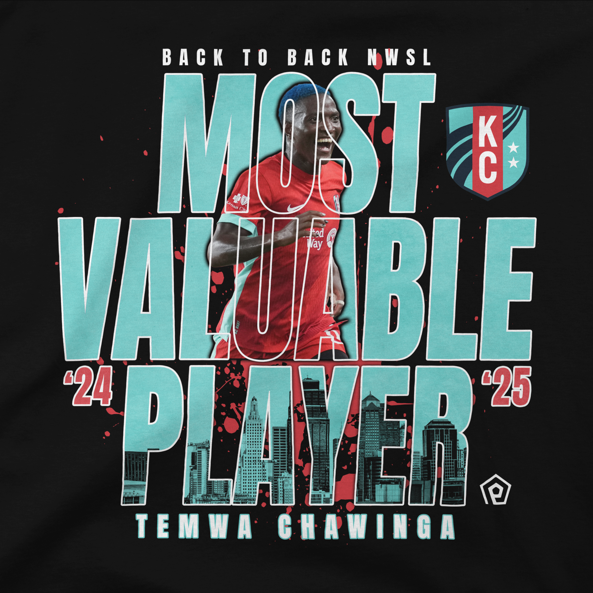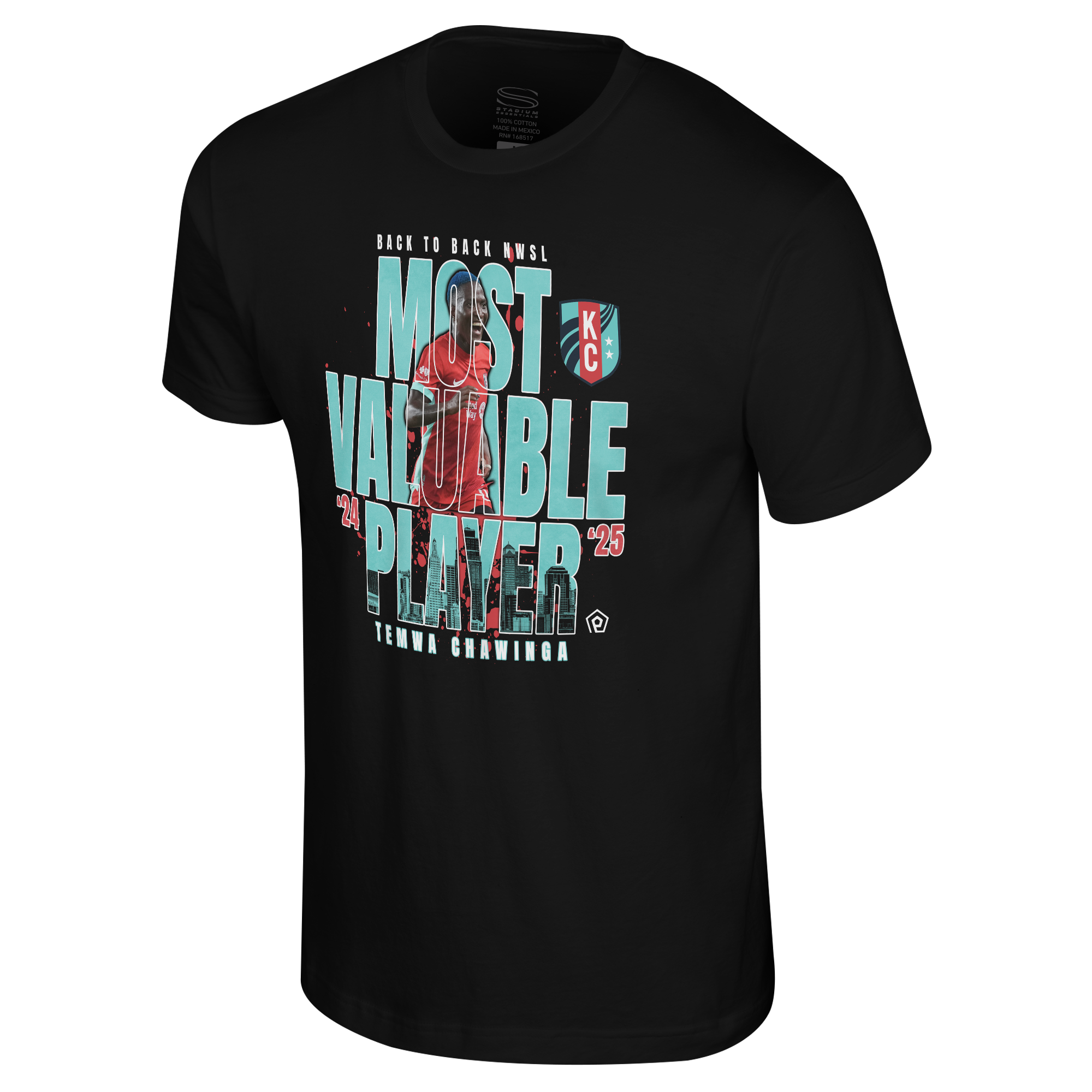 Celebrate the reign of the league's best with the Temwa Chawinga Back-to-Back NWSL MVP T-Shirt! This bold black tee commemorates Temwa Chawinga's incredible achievement as the 2024 and 2025 Most Valuable Player (MVP). The front features a dynamic graphic of the player, framed by the words "MOST VALUABLE PLAYER" in striking teal and a subtle Kansas City skyline. This premium shirt is a highly collectible piece of KC Current player merchandise and the perfect way to honor one of the NWSL's all-time greats. A must-have for every dedicated Kansas City Current fan.