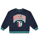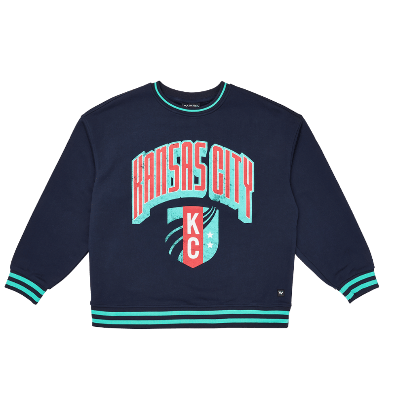 Stay cozy in style with the KC Current Oversized Bold KC Crewneck. This deep navy blue sweatshirt offers a relaxed, roomy fit for ultimate comfort. It features a prominent, arched "KANSAS CITY" graphic in bright teal and red, centered above a large, detailed rendition of the KC Current crest shield. Ribbed cuffs and hem with bold teal stripes add an extra layer of athletic flair. This is the perfect unisex NWSL pullover for fans looking for a comfortable, statement piece in the club's primary colors.