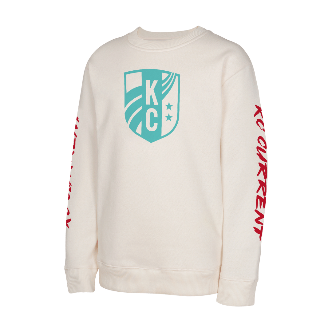 Let young fans shine in the KC Current Youth Star Power Fleece Crewneck! This cream-colored crewneck features a bold KC Current crest on the front and "KC Current" script running down both sleeves in striking red. Made from soft fleece fabric, this pullover is perfect for staying warm while repping their favorite team in style—on game day or any day!