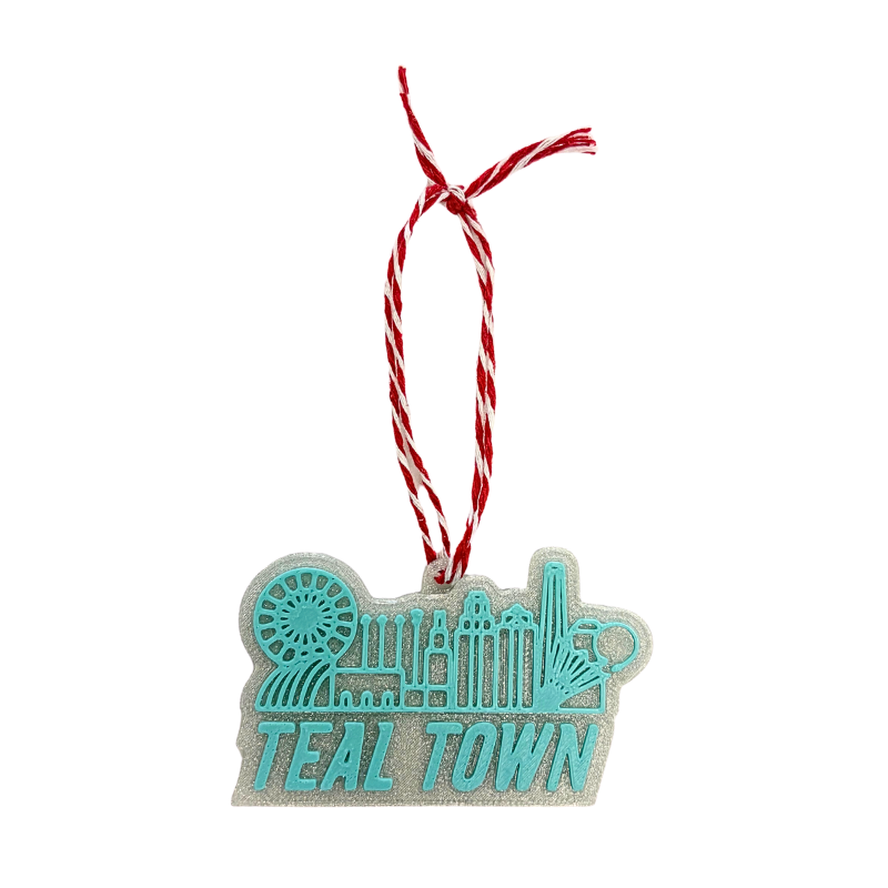Featuring a glittery, durable construction, the ornament showcases the iconic Kansas City skyline silhouette and the slogan "TEAL TOWN" in the vibrant teal team color. Finished with a classic red and white baker's twine loop, it's ready to hang on your tree, car, or anywhere you want to show off your KC spirit.