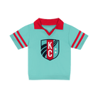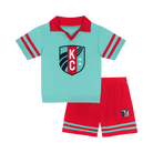 Let the little ones rep their KC Current spirit in style with the Toddler Charming Dude Matching Short Set! This adorable two-piece set includes a teal collared top with bold KC Current crest and striped red sleeves, paired with matching red shorts featuring a coordinating crest and stripe details. Designed for all-day comfort, this set is perfect for future soccer stars cheering on KC Current from day one!