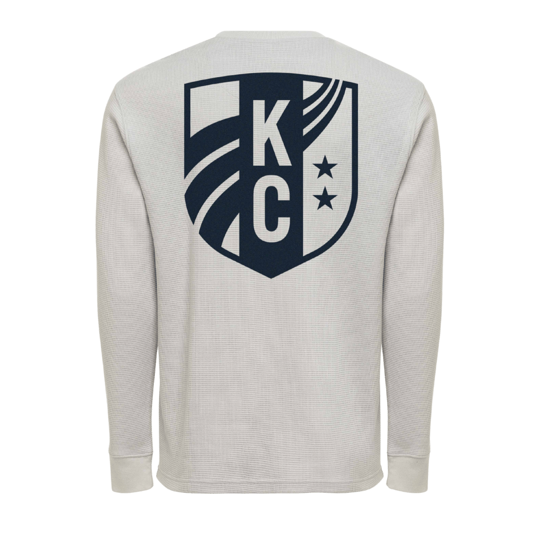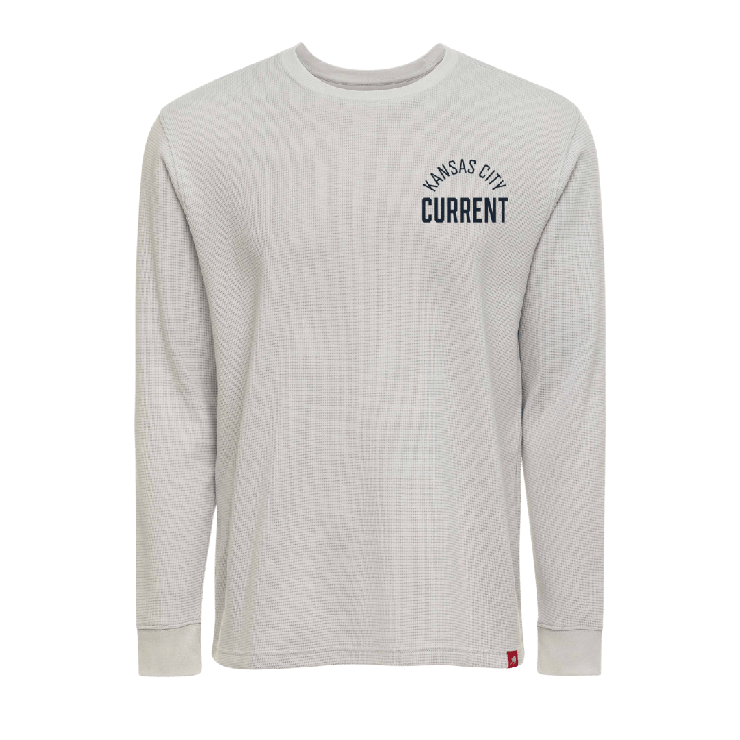 Layer up your team spirit with the KC Current Unisex Arched Thermal Long Sleeve. This light gray waffle-knit thermal shirt is perfect for transitional weather, offering cozy texture and warmth. It features a subtle, navy "KANSAS CITY CURRENT" arched graphic on the left chest. An essential, understated piece of Kansas City Current fan gear designed for comfort and durability.