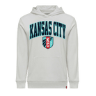 KC Current Unisex Legacy Arch Hoodie: Make a bold statement with this standout light gray pullover hoodie. It features a vibrant, multi-color "KANSAS CITY" arched graphic in the club's signature teal and red, centered around the iconic KC Current crest. This premium, cozy fleece is designed for maximum comfort and high-impact style, making it a must-have piece of Kansas City Current NWSL apparel for the dedicated fan.