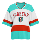 This retro-inspired KC Current V-neck football t-shirt for women combines vintage style with modern team spirit. Featuring bold horizontal stripes in teal, white, and red, this shirt showcases the "CURRENT" wordmark across the chest in a classic collegiate font. The iconic KC Current shield crest is centered below, making it a standout piece for any fan. Made from soft, comfortable fabric, it's perfect for game days, tailgating, or everyday wear. Show your support for the Kansas City Current with this fashionable and comfortable tee.