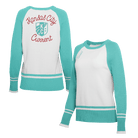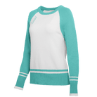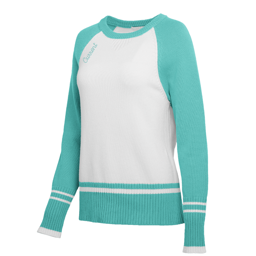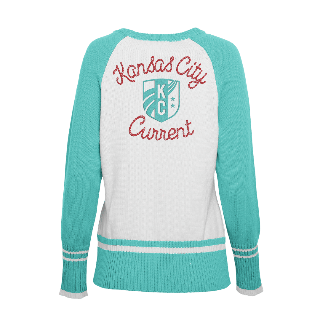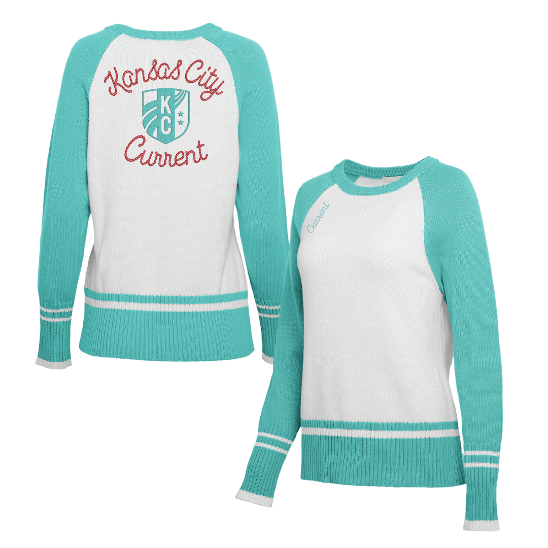 Show off your team pride with everyday comfort in the KC Current Women’s Timeless Colorblock Sweater. This soft knit sweater features a white body with teal raglan sleeves and retro striping at the hem and cuffs. “Kansas City Current” lettering and the team crest adorn the back, while a subtle “Current” script on the front adds a touch of understated team spirit. Perfect for chilly match days, work-from-home comfort, or weekend errands, this sweater combines classic style with KC Current pride.