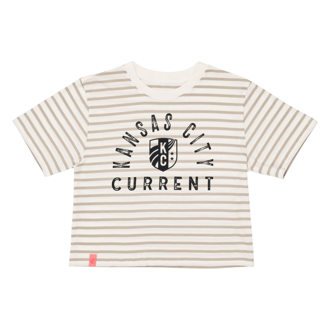 This neutral-striped tee features the bold KC Current crest and wordmark front and center. A laid-back look with elevated detail, it’s perfect for everyday fanwear with a touch of flair.