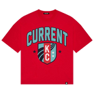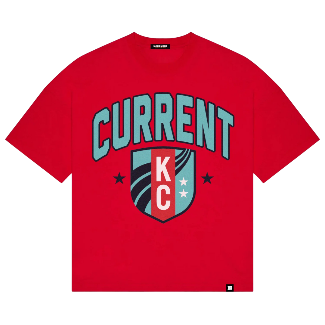 Rep the crest. This heavyweight red tee features bold "CURRENT" lettering arched above a standout KC Current crest, designed by local streetwear legends MADE MOBB. With its boxy cut and premium feel, this shirt is built for matchdays and street style alike.