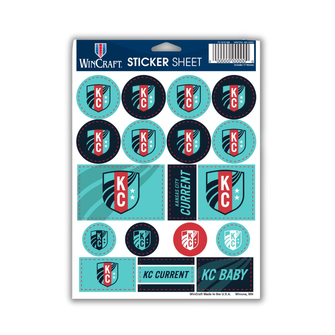Personalize your belongings with the KC Current Sticker Sheet. This collection includes a variety of stickers featuring the team's vibrant teal color and bold crest, allowing you to showcase your Kansas City Current pride on laptops, water bottles, notebooks, and more. Durable and easy to apply, these stickers are perfect for fans looking to add a touch of team spirit to everyday items.