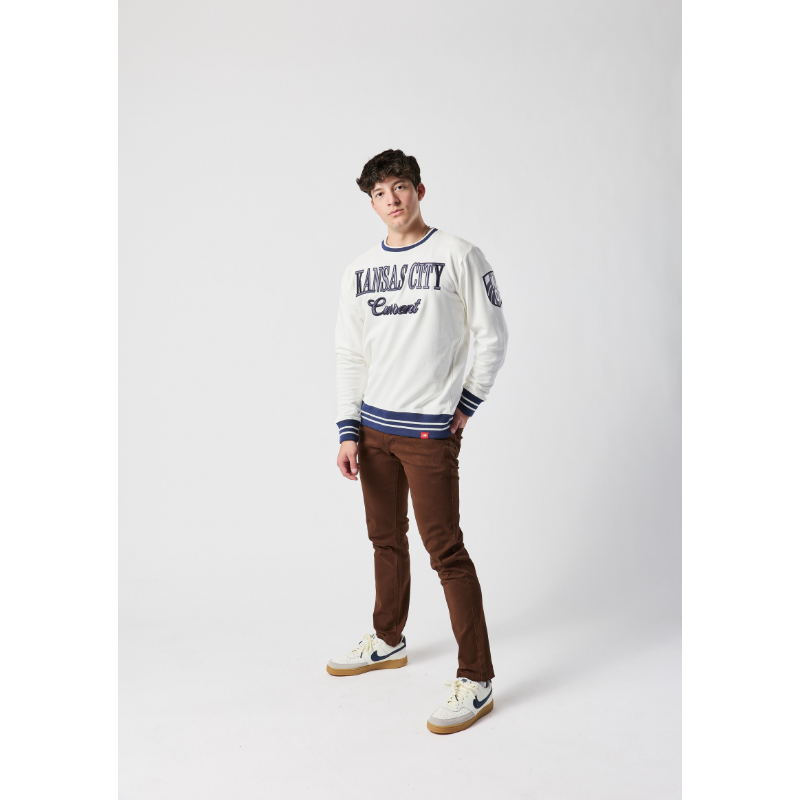 This isn't your average sweatshirt. Part of our premium Sportiqe collection, this cream crewneck features high-definition navy embroidery and athletic-inspired striped detailing. It’s a heavy-weight, luxury piece of fan gear that feels as good as it looks.