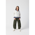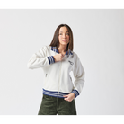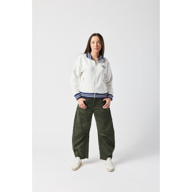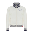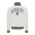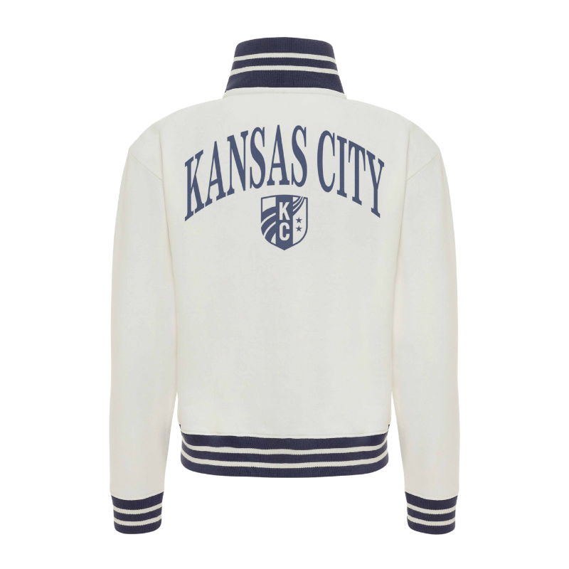 Stay warm while showing off your KC pride. This cream-colored track jacket offers a sophisticated take on fan apparel, featuring bold navy and white striped ribbing on the collar, cuffs, and hem. With the club's name in elegant script on the front and a large arched graphic on the back, you'll represent the Current from every angle.