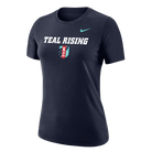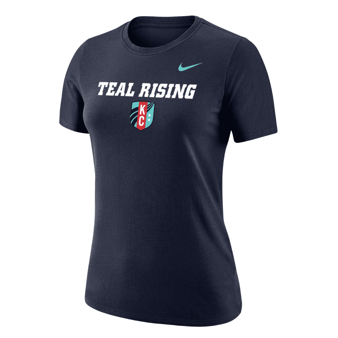 Rise in style with the KC Current Women's Nike Teal Rising T-Shirt! Featuring the iconic "Teal Rising" slogan and team crest, this navy tee blends team pride with premium comfort. Designed by Nike, it’s made from soft, breathable fabric that moves with you, making it perfect for game days, workouts, or casual outings. Represent the rising tide of KC spirit with this must-have wardrobe essential.