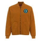 KC Current Unisex Club Crest Quilted Jacket: Elevate your outerwear collection with this stylish quilted bomber jacket. The rich brown/tan jacket features a subtle diamond quilt pattern and an embroidered blue/teal patch with the Kansas City Current club crest on the chest. Perfect as a mid-weight jacket, it offers a blend of fashion and team pride for the dedicated NWSL supporter.
