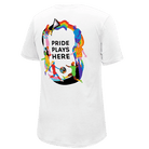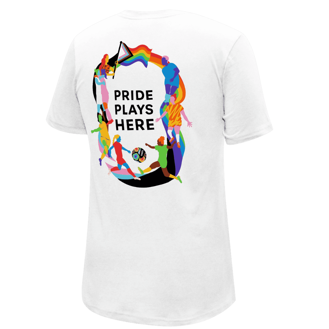 Celebrate your support for the NWSL and Pride with the Pride Plays Here Tee. This eye-catching tee features a bold graphic showcasing your commitment to the league and its values. Made from soft, high-quality fabric, it offers a comfortable fit for everyday wear or game days. Perfect for fans who want to display their pride and support for women's soccer, this tee is a must-have addition to your fan gear collection.