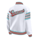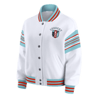 Rep your team in retro-inspired fashion with the KC Current Women’s Classic Stripe Jacket. Designed with a crisp white base, teal-and-red striped accents, and bold “Current” script across the back, this varsity-style jacket blends heritage and modern flair. Featuring a snap-button front, rib-knit collar, cuffs, and waistband for a comfortable fit, it’s perfect for layering on game days or casual outings. The KC Current crest on the chest proudly shows your support for Kansas City’s NWSL team. Whether you’re at the stadium or out on the town, this jacket makes a statement while keeping you warm.