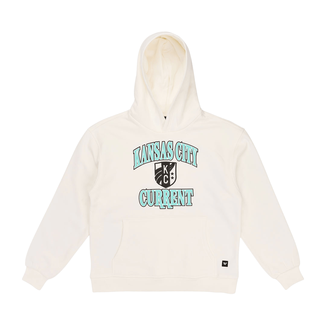 Stand out in bold comfort with the KC Current Women’s Crest Puff Hoodie. This cream pullover features a striking “Kansas City Current” arch graphic and a raised puff-paint KC crest for added texture and dimension. With a cozy fit, front kangaroo pocket, and soft fleece interior, it’s the perfect blend of streetwear style and team pride.