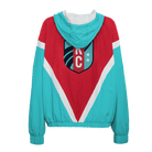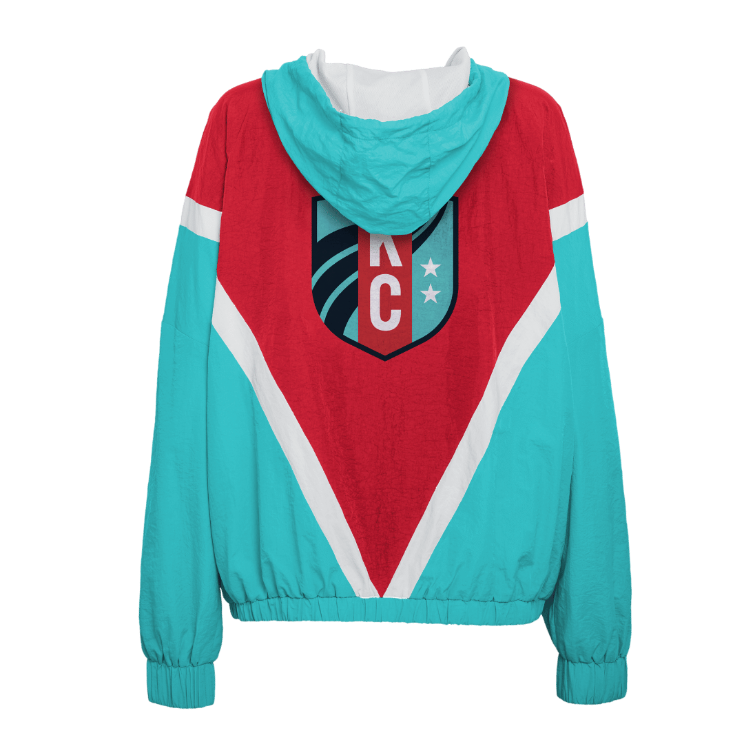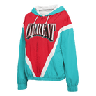 Brave the elements in style with the KC Current women's windbreaker. This eye-catching jacket features a vibrant color-blocked design in red and teal, with a bold "CURRENT" wordmark printed prominently on the chest. The white V-shaped stripe adds a dynamic and athletic look. Complete with a hood and full-zip front, this windbreaker is both functional and fashionable. Whether you're at the stadium or on the go, this jacket is the perfect way to represent the Kansas City Current.