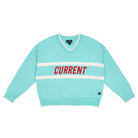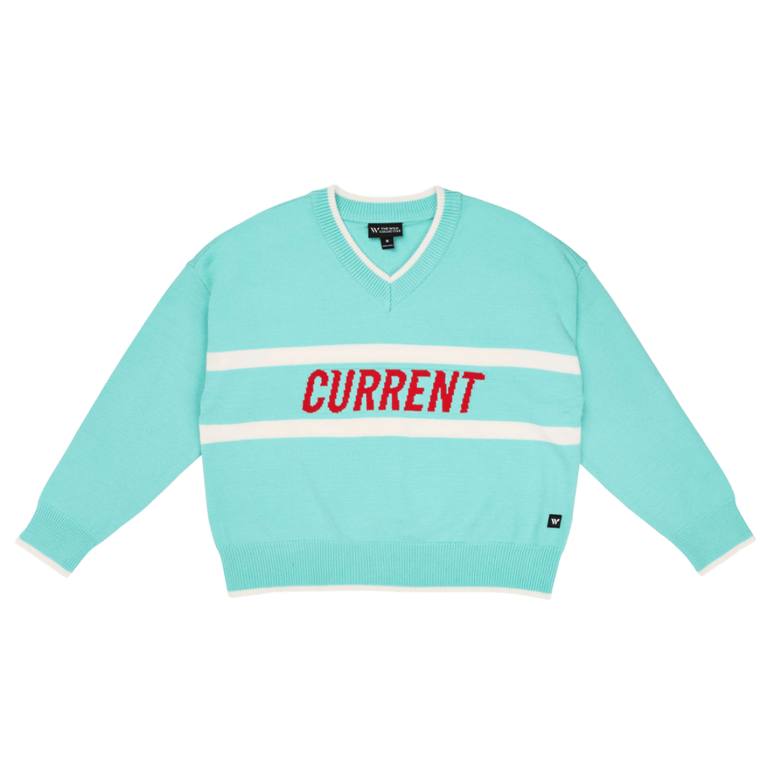 Elevate your matchday style with the KC Current Women’s Stripe V-Neck Sweater. This teal knit sweater features bold white stripes and a standout red “CURRENT” wordmark across the chest. Designed with a flattering V-neckline and ribbed trim for a comfortable fit, it’s the perfect blend of vintage varsity vibes and modern fan pride.