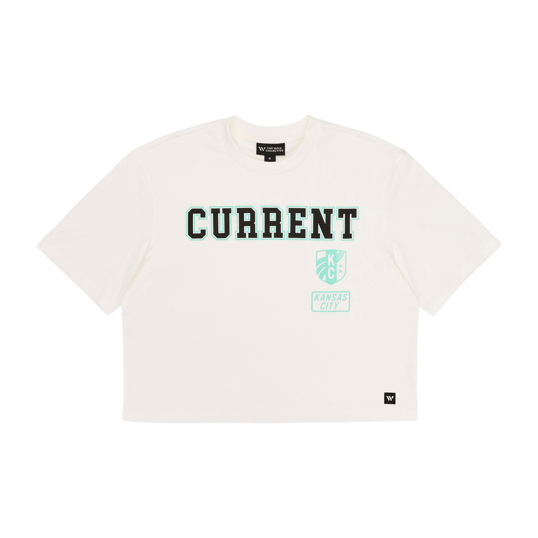 Keep it clean, bold, and effortless in the KC Current Women’s Crested Crop T-Shirt. This cropped cream tee features classic varsity “CURRENT” lettering across the chest and a mint KC Current crest layered beneath for a fresh, minimal look. Perfect for pairing with high-waisted jeans or joggers, this tee brings sporty energy to your everyday rotation.