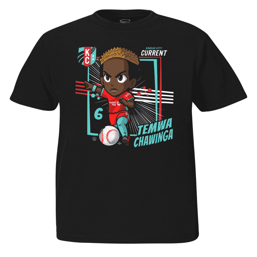 The Chawinga Youth Chibi Tee is a stylish t-shirt featuring a digital print graphic of player Chawinga in a cute chibi design. This youth-sized tee is both soft and comfortable. It's perfect for young fans to showcase their support for Kansas City Current in playful fashion.