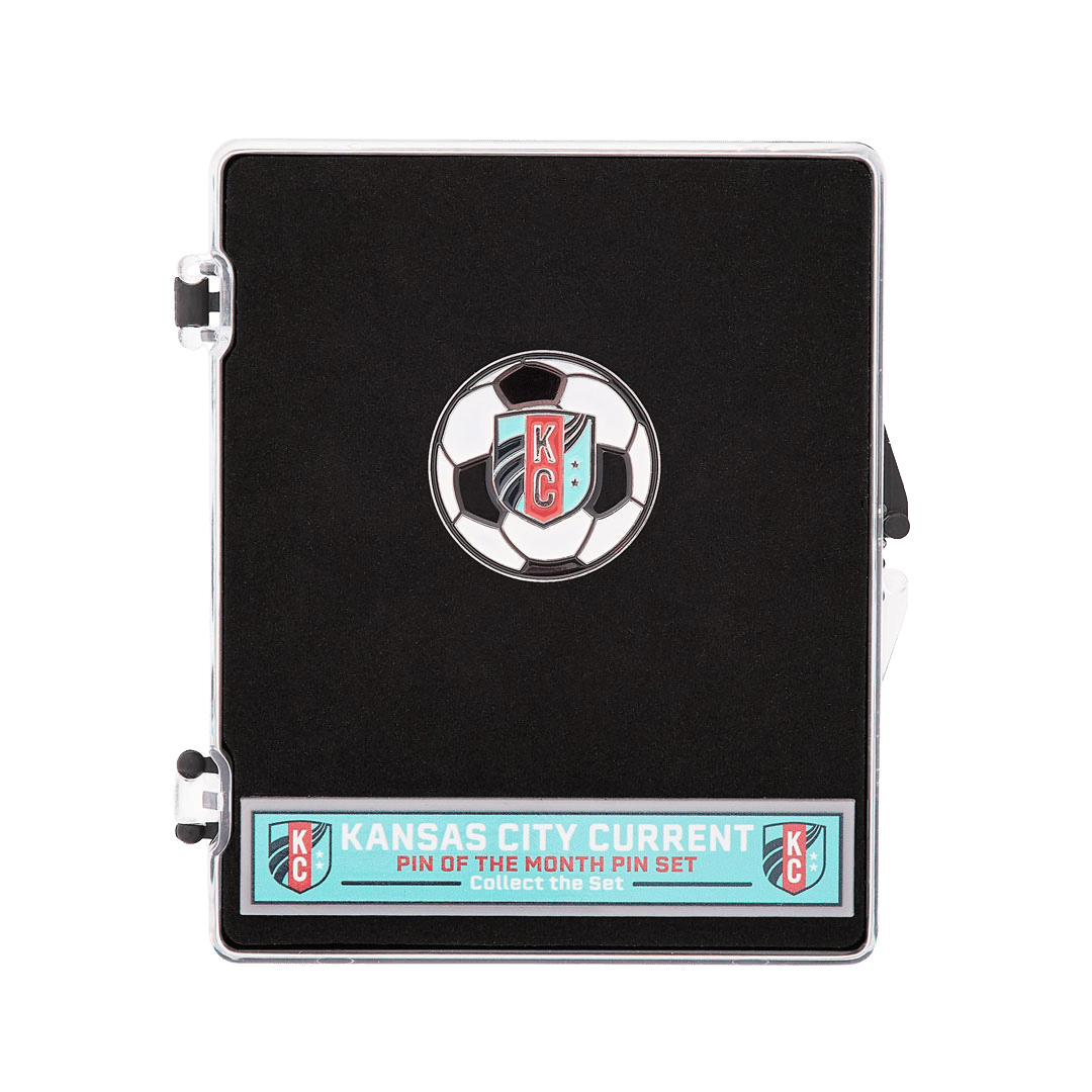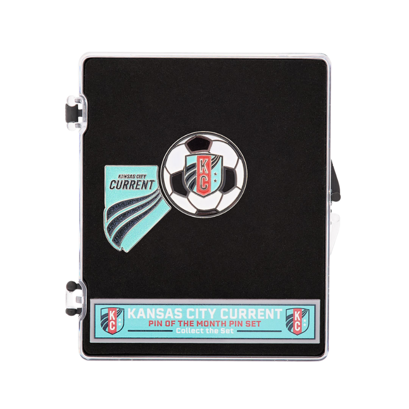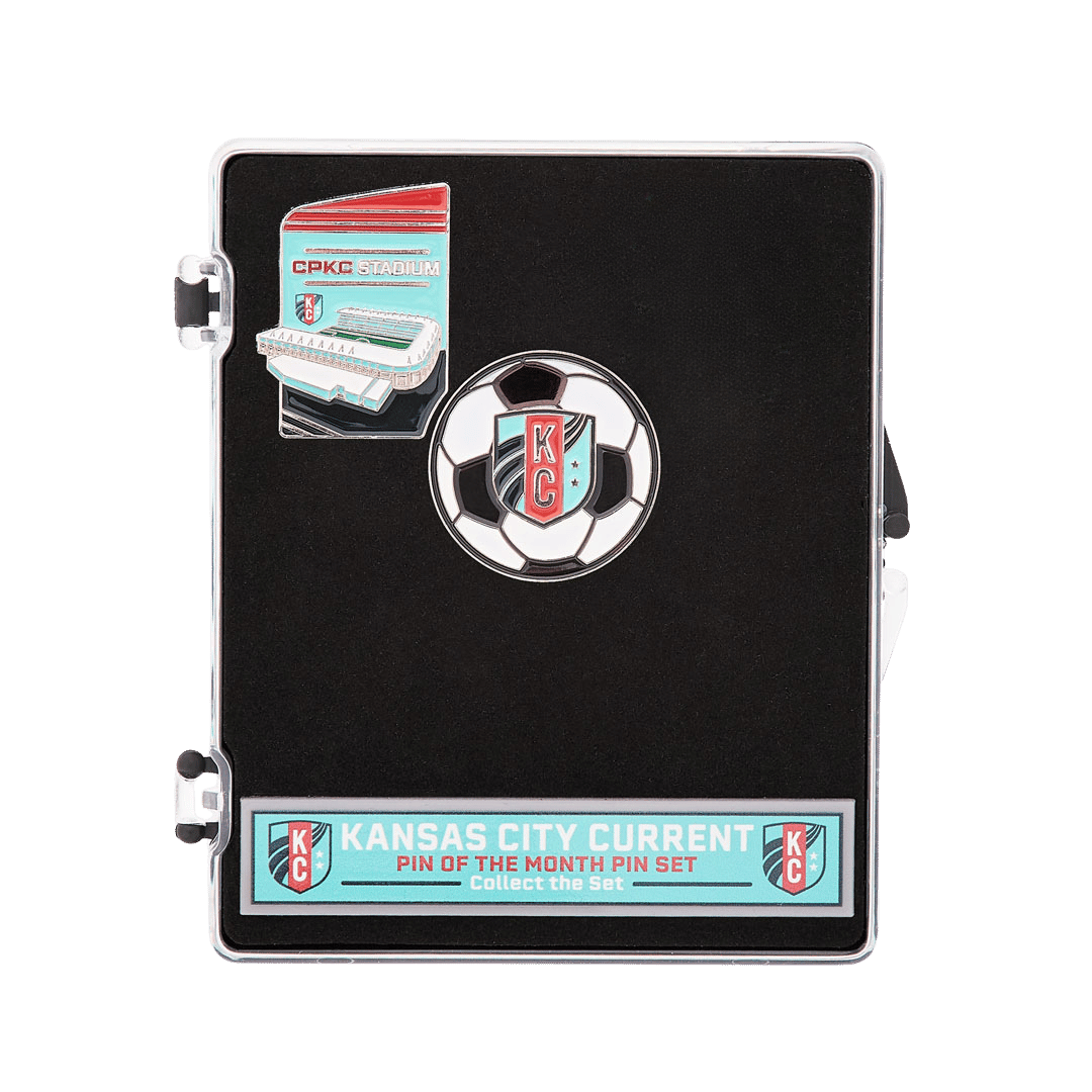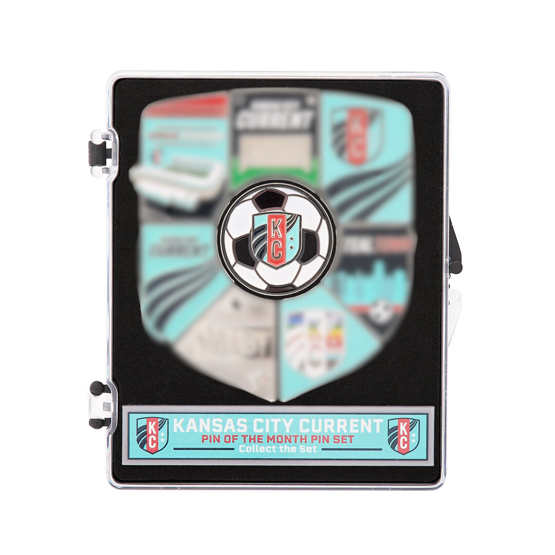 The KC Current Pin of the Month set features a unique, collectible pin(s) released monthly, each representing a piece of the team's identity. When collected, the pins form a complete crest-inspired design centered around a soccer ball and the KC Current shield.