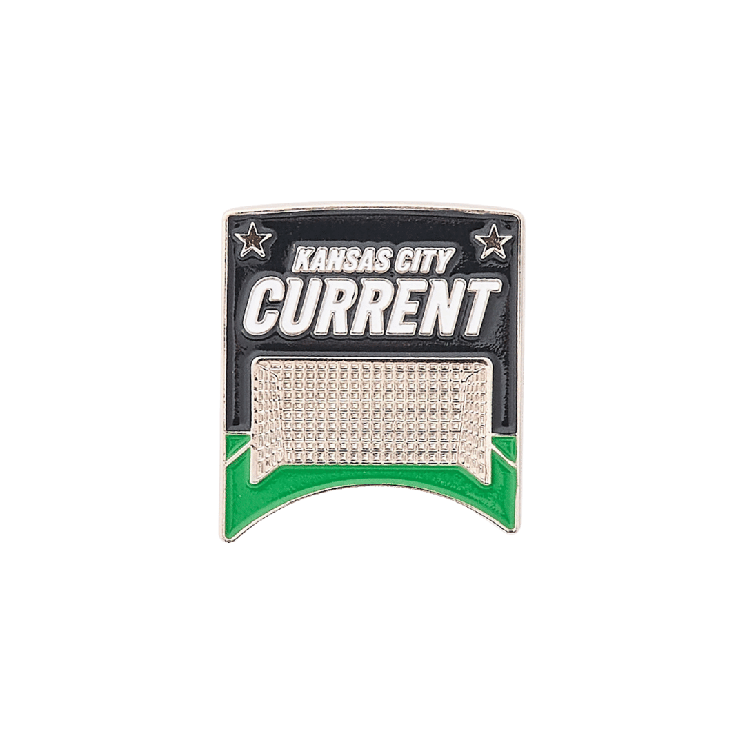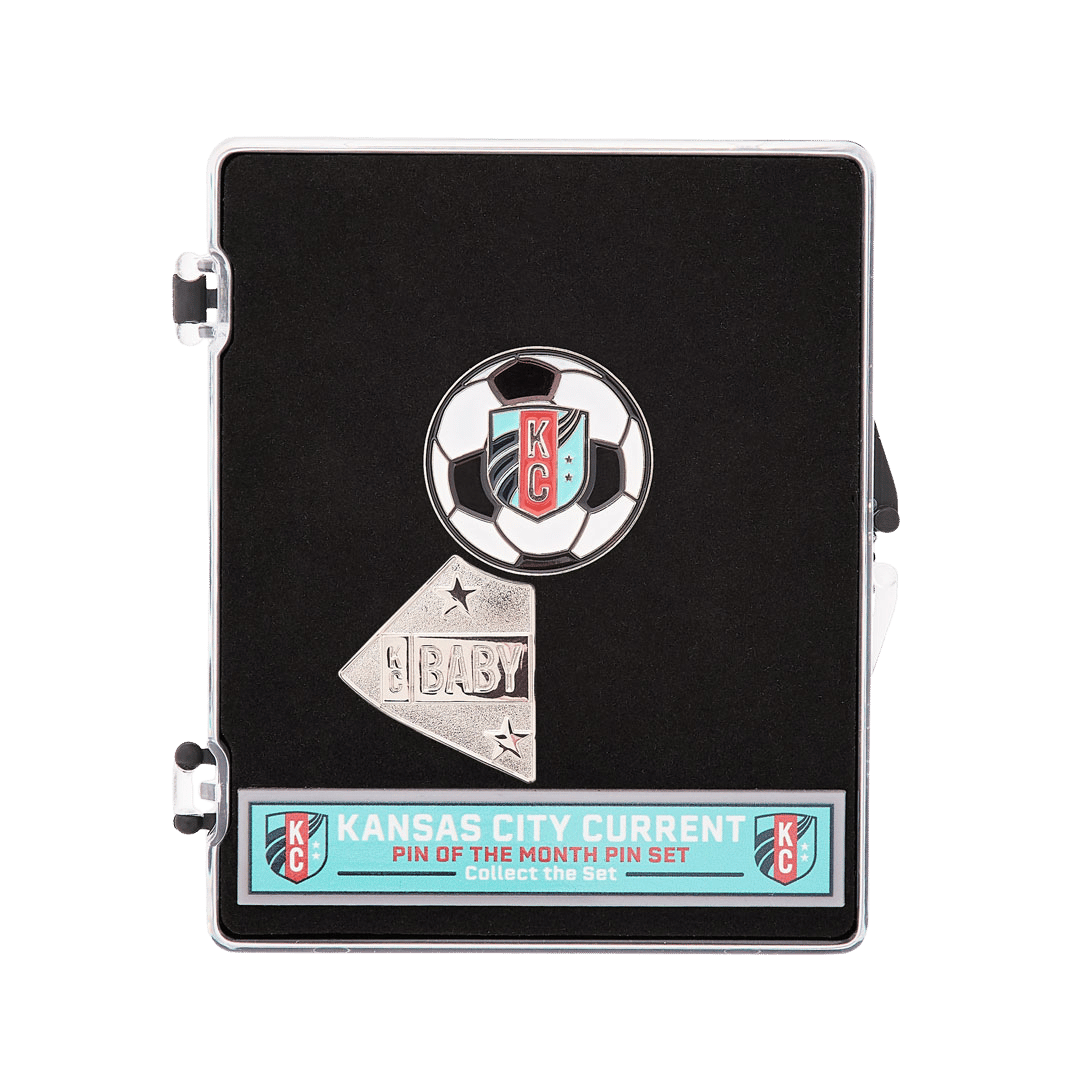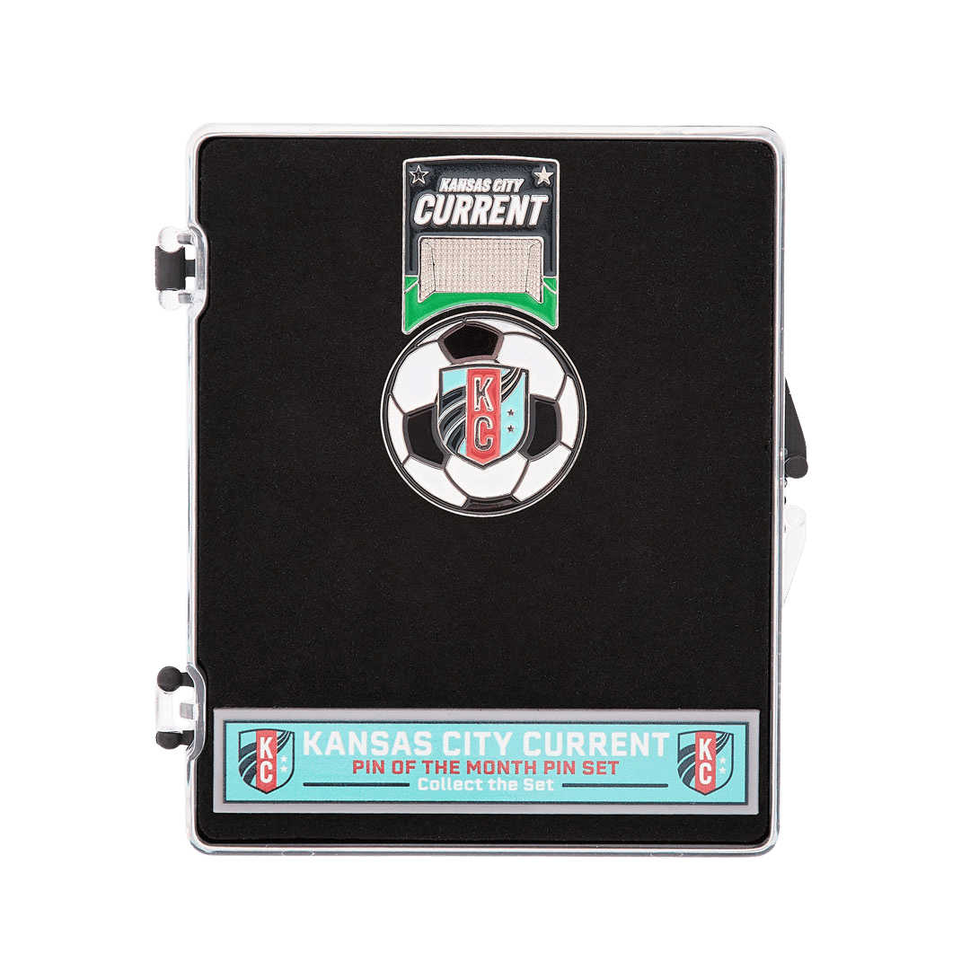 The KC Current Pin of the Month set features a unique, collectible pin(s) released monthly, each representing a piece of the team's identity. When collected, the pins form a complete crest-inspired design centered around a soccer ball and the KC Current shield.