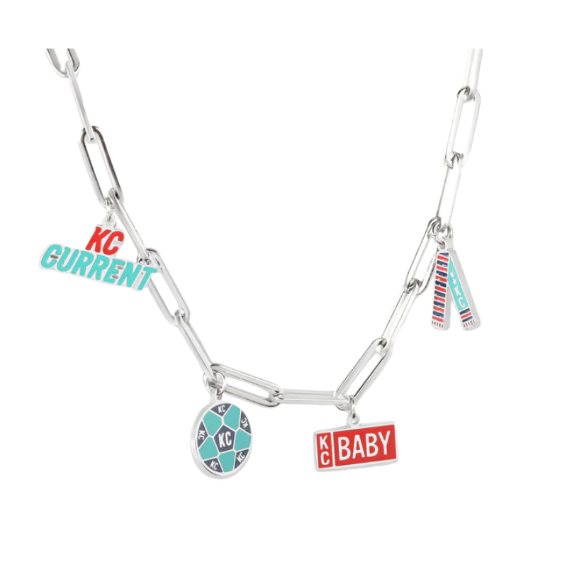 Elevate your game day look with the bold KC Current Statement Charm Necklace, a unique piece from the exclusive KC Current x Eb & Co collaboration. This trendy silver-tone chain necklace is adorned with multiple colorful charms, including "KC CURRENT," "KC BABY," and a stylized soccer ball/star design in the team's signature teal and red. It's the perfect Kansas City Current jewelry to showcase your team loyalty. A fantastic KC Current gift for fans who love a chic, spirited accessory.