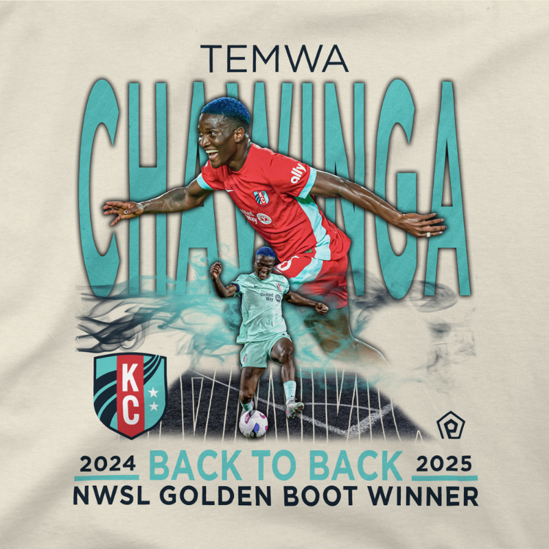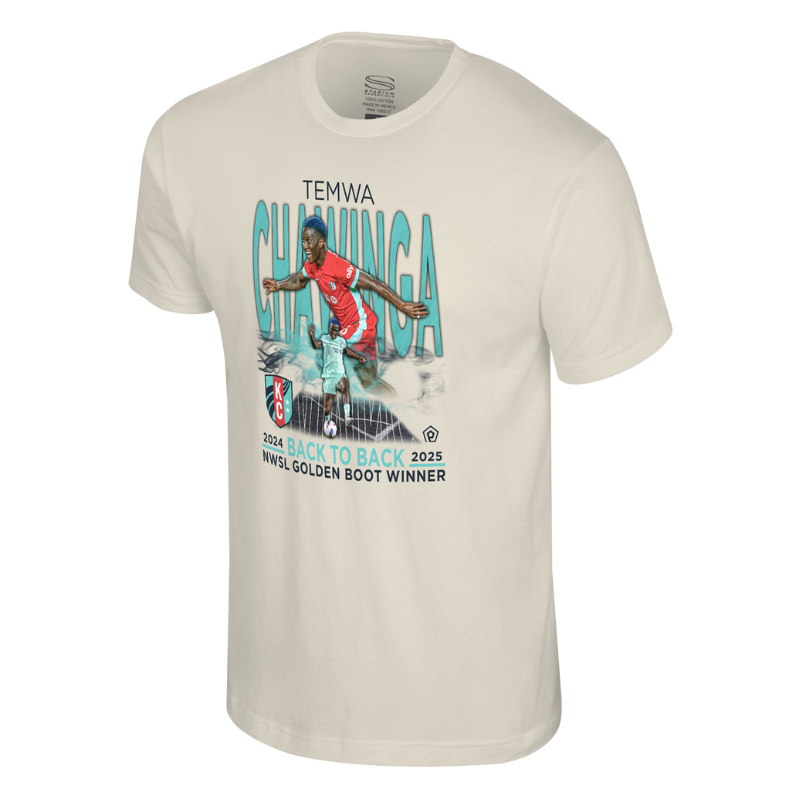 Celebrate the incredible accomplishment of Temwa Chawinga, the 2024 and 2025 Back-to-Back NWSL Golden Boot Winner, with this commemorative graphic T-shirt! The tee features a dynamic image of Temwa celebrating, overlaid with her name and the powerful text: "2024 BACK TO BACK 2025 NWSL GOLDEN BOOT WINNER." Printed on a soft, natural/cream-colored shirt, this unisex KC Current tee is the perfect way to honor one of the most dominant scorers in league history. It’s a must-have piece of Kansas City Current merchandise for any devoted fan and collector.