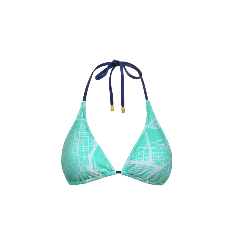 Make a splash with the KC Current Teal Map Bikini Top. Featuring a custom-designed topographic map of Kansas City in the team’s signature teal, this top blends local pride with a premium beachwear feel. The adjustable navy ties and gold-tone hardware add a touch of luxury to your match-day sunbathing.